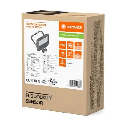 Ledvance LED Floodlight Aluminium Black 8W 1200lm 100D - 840 Cool White | IP65 - Motion And Light Sensor - Symmetrical
