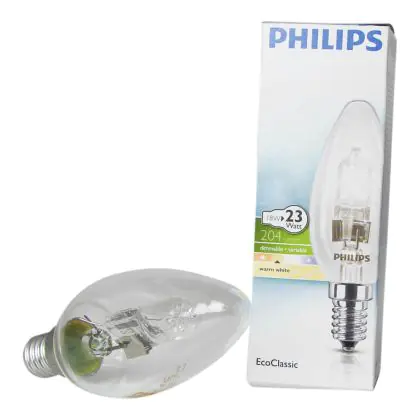 Philips EcoClassic Candle B35 are candles shaped halogen lamps replacing perfectly your old incandescent lamps. These lamps allow you to maintain a high quality light while saving energy (compared to your old incandescent lamps). All lamps in this range have a E14 base and a B35 shape.
